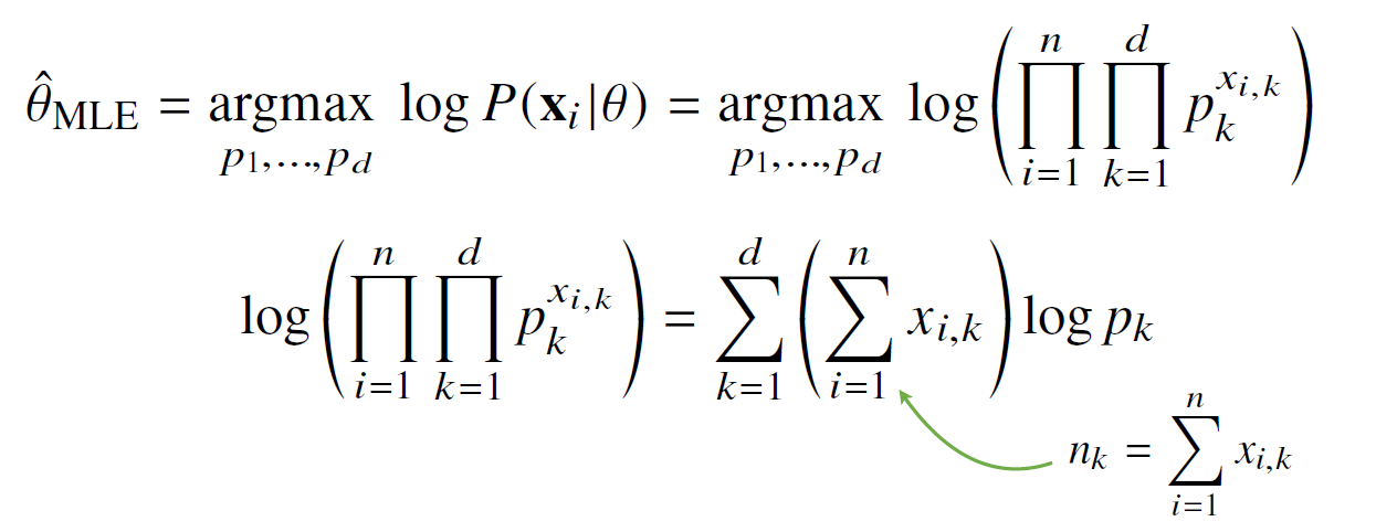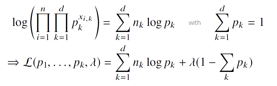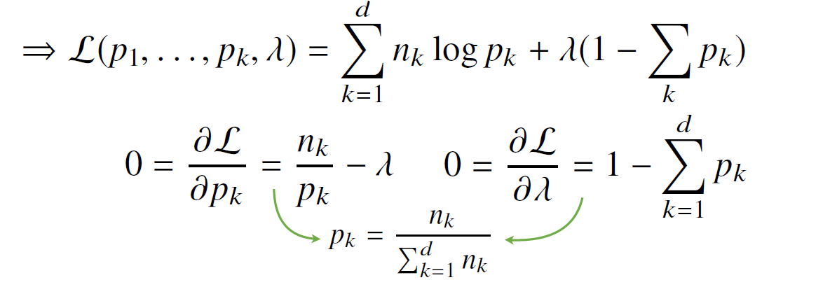 카테고리 분포 모수 제약식을 만족하면서 위의 목적식을 최대화하는 것이 구하고자 하는 MLE