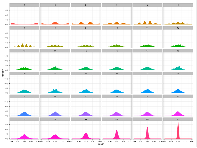 베르누이분포의 표본평균의 분포원래 확률분포는 이항분포이고, 이항분포의 표본분포는 정규분포가 될 수 없지만, 이항분포에서 추출한 통계량(표본평균)의 확률분포는 정규분포로 가고 이를 중심극한정리라고 한다.