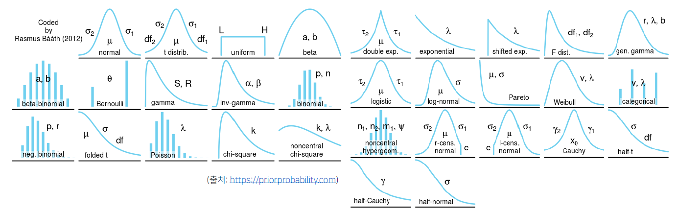 카테고리분포 : 0 또는 1 값만 가지는K개 베르누이 분포 벡터를 가지는 다변수 확률 분포(다변수 확률 변수의 각 원소 중 하나만 1이 될 수 있다). K개의 값 중 하나가 나오는 확률 변수의 분포(ex. 주사위)
