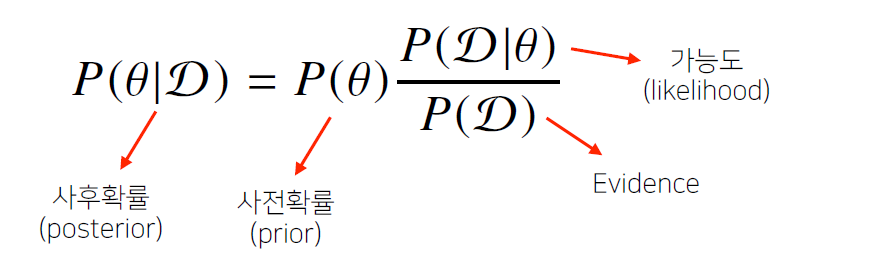 D : 관찰하는 데이터 / θ : 모수(계산하고자 하는 파라미터) / 사후확률은 데이터 관찰 후에 측정한 확률이고, 사전확률은 데이터가 주어지지 않은 상황에서 사전에 주어진 확률 / likelihood : 현재 데이터에서 어떤 모수가 관찰될 확률 / evidence : 데이터 자체의 분포