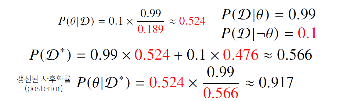 베이즈 정리를 통해 새로운 데이터가 들어왔을 때 앞서 계산한 사후확률을 사전확률로 사용하여 갱신된 사후확률을 계산할 수 있다 - 베이즈 정리의 장점(새로운 사후확률 업데이트 가능)
