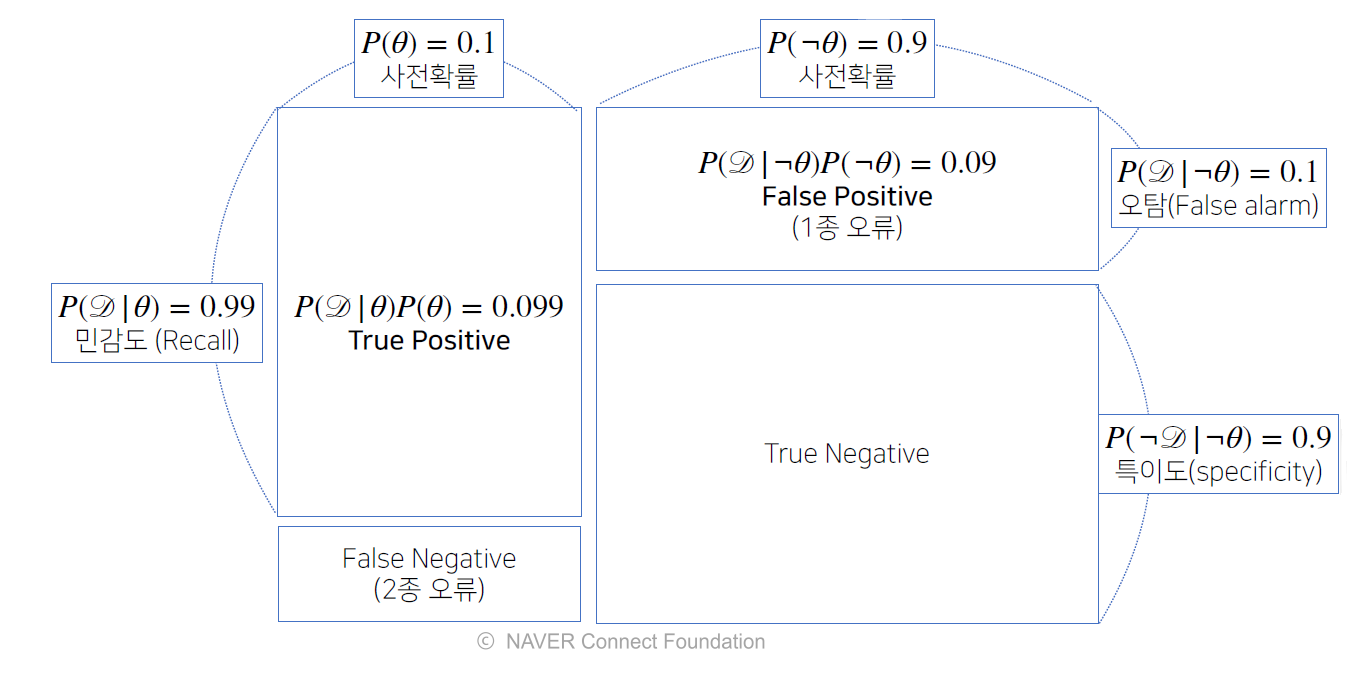 θ = Covid-19 발병 사건으로 정의(관찰불가) / D = 테스트 결과라고 정의(관찰가능)