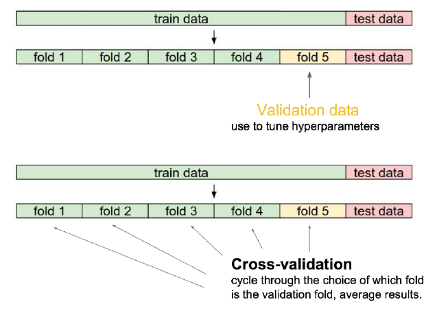 사용 방법 : cross validation으로 최적의 하이퍼파라미터를 찾고, 학습을 할 때는 K개의 셋을 모두 사용한다. 학습하는 데이터가 많을수록 성능이 좋아진다.