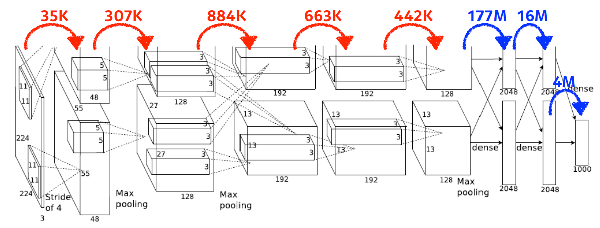 파라미터마다 2를 곱해주는 이유 : AlexNet은 GPU 메모리의 한계로 두 개의 GPU가 네트워크를 반씩 계산한다.