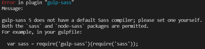 Message : gulp-sass 5 does not have a default Sass compiler; please set one yourself.