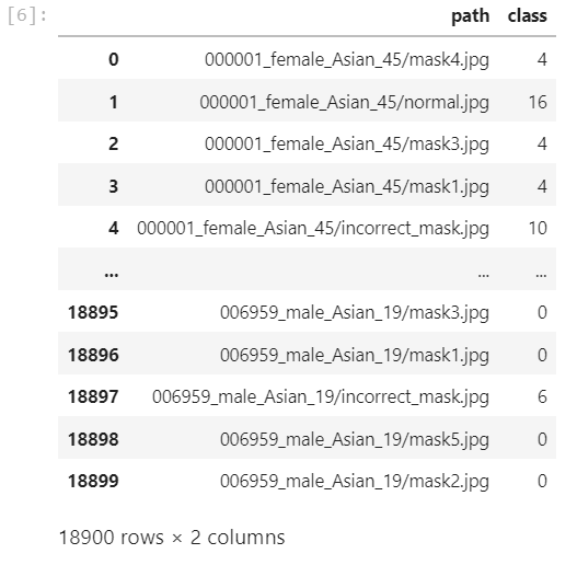 - 목표 데이터 구조로 변경 : 각 이미지(2700*7=18900)을 path와 class(0~17)를 칼럼으로 하는 dataframe에 정리.