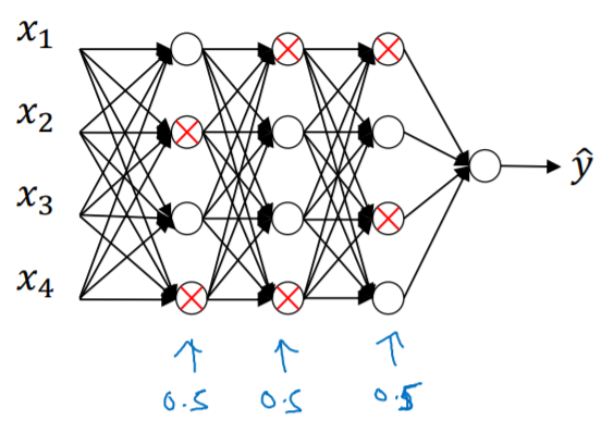 Dropout is to set some probability(here 0.5) of eliminating a node in neural network. We are going to keeping or removing each node with a probability of 0.5.