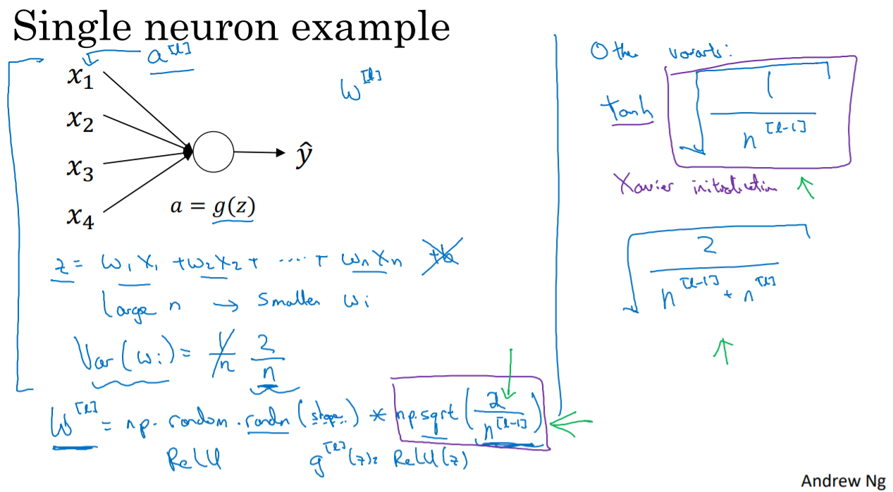 For example, let's suppose we use a tanh function as an activation function.W value is close to zero if lambda is big number because the cost function J should be close to zero. Tanh function has linear slope in the scope near zero, but it has smooth slope away from the zero.๋น์ฉํจ์๋ ๊ฐ์ด ์์์ ธ์ผํ๊ธฐ ๋๋ฌธ์ ๋๋ค๋ฅผ ํฐ ์๋ก ํ๋ฉด W๋ 0์ ๊ฐ๊น์์ ธ์ผ ํ๋ค. z = wx+b ์์ w๊ฐ 0์ ๊ฐ๊น์์ง๋ฉด z๋ 0์ ๊ฐ๊น์์ง๊ฒ ๋๋ค. z๋ tanh(ํ์ฑํจ์)์ input์ด ๋๋๋ฐ, tanh์ ๊ฒฝ์ฐ 0 ์ฃผ๋ณ์ ๊ธฐ์ธ๊ธฐ๋ linear function์ ๊ฐ๊น์์ ์๋์ ์ผ๋ก ์ ์ฒด์ ์ธ ํจ์๊ฐ linearํ๊ฒ ๋๋ฉฐ ์ฌํํด์ง๋ ํจ๊ณผ๊ฐ ๋ฐ์ํ๋ค.