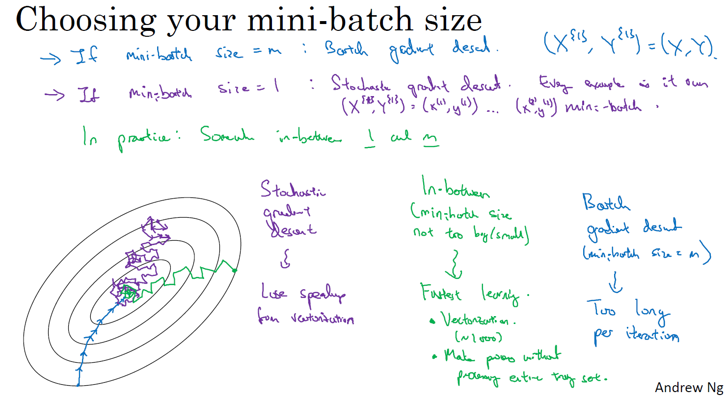 batch๊ฐ ์ฌ๋ฌ๊ฐ์ธ ๊ฒฝ์ฐ์๋ ๊ฐ iteration๋ง๋ค ๋๋ฌด ๋ง์ ์๊ฐ์ด ๊ฑธ๋ฆฌ๊ณ , batch size๊ฐ 1์ธ ๊ฒฝ์ฐ(Stochastic Gradient Descent)์๋ ํ๋ จ ์๋๊ฐ ๋๋ฌด ์ค๋๊ฑธ๋ฆฐ๋ค(lose speedup from vecterization). ๋ฐ๋ผ์ ์ ๋นํ batch size๋ฅผ ์ฐพ์์ผํ๋ค.
