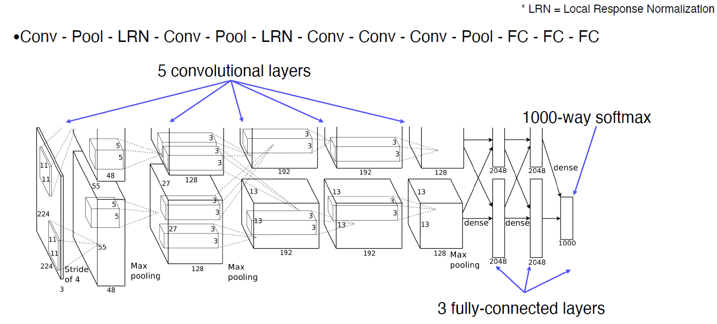 - LRN은 activation map에서 명암을 normalization 하는 기능인데, 최근에는 Batch normalization을 사용하면서 더이상 LRN을 사용하지 않게 되어서 빠지게 되었다.