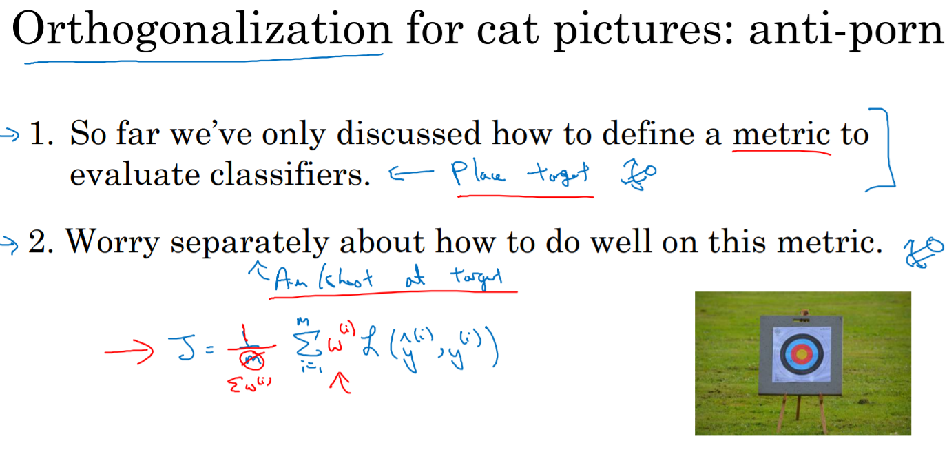 weight๋ฅผ ์ฃผ์ด์ metric์ ๋ฐ๊พธ๋ ๋ฐฉ๋ฒ์ด ์๋ค. A ๋ถ๋ฅ๊ธฐ๊ฐ B ๋ถ๋ฅ๊ธฐ๋ณด๋ค cat classifier๋ก์์ ์ฑ๋ฅ์ด ๋ ์ข์ง๋ง A๋ ํฌ๋ฅด๋ ธ๋ฅผ ๊ตฌ๋ถํ๋ ๋ฅ๋ ฅ์ด B๋ณด๋ค ์๋ค๊ณ ํ๋ฉด, ์ฌ์ฉ์๋ B ๋ถ๋ฅ๊ธฐ๋ฅผ ์ ํํ๊ฒ ๋๋ค. ๋ฐ๋ผ์ metric์์ ํฌ๋ฅด๋ ธ ์ฌ์ง์ ๋ํด์๋ 10์ ๊ณฑํ๊ณ ํฌ๋ฅด๋ ธ๊ฐ ์๋ ์ฌ์ง ์ฌ์ง์ ๋ํด์๋ weight๋ฅผ 1์ ๊ณฑํด์ ํฌ๋ฅด๋ ธ ์ฌ์ง์ ๋ํ cost function value๋ฅผ ํฌ๊ฒ ๋ง๋ค์ด์ค ์ ์๋ค.