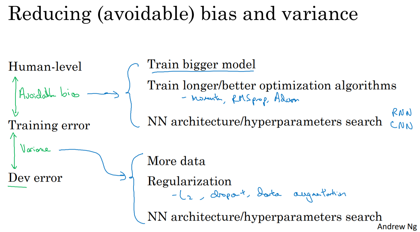 - Fit training set well on cost function : bigger network, better optimization algorithm(like Adam)