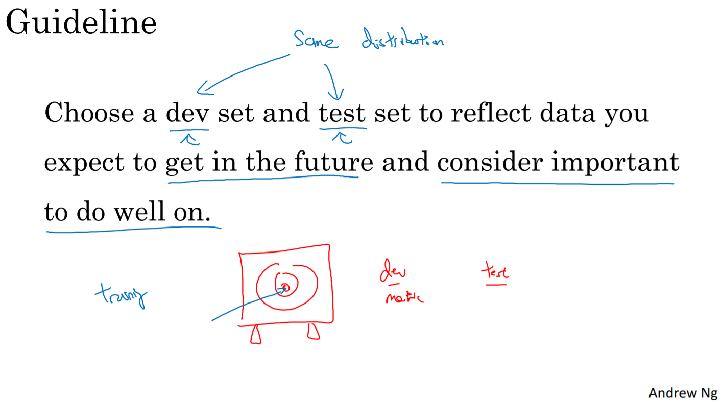 dev set๊ณผ test set์ ๋ถํฌ ํํ๋ ๊ฐ์์ผ ํ๋ค. ์๋ฅผ ๋ค์ด, ์ด๋ฏธ์ง ๋ถ๋ฅ๋ฅผ ์ํด ๋ฏธ๊ตญ, ์ ๋ฝ, ํ๊ตญ, ๋ธ๋ผ์ง, ์ค๊ตญ ๋ฑ์ ๋๋ผ๊ฐ ์๋๋ฐ dev set์ ๋ฏธ๊ตญ, ์ ๋ฝ, ํ๊ตญ์ ์ฌ์ฉํ๊ณ test set์๋ ๋ธ๋ผ์ง, ์ค๊ตญ์ ์ฌ์ฉํ๋ฉด ์ด๋ฏธ์ง์ ๋ถํฌ๊ฐ ๋ฌ๋ผ์ง๋ค. ๋ฐ๋ผ์ ์ ์ ํ๊ฒ ์์ ์ด๋ฏธ์ง ๋ฐ์ดํฐ์ ์ ์ฌ์ฉํด์ผ ํ๋ค.