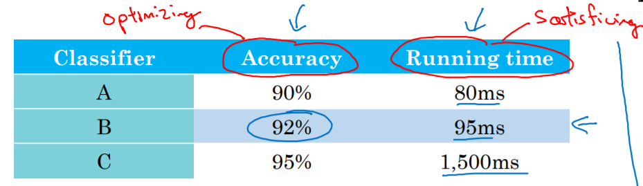 Accuracy๊ฐ optimizing Metric์ด๊ณ , Running time ๋ฑ์ ์์๊ฐ Satisficing Metric์ด ๋๋ค.