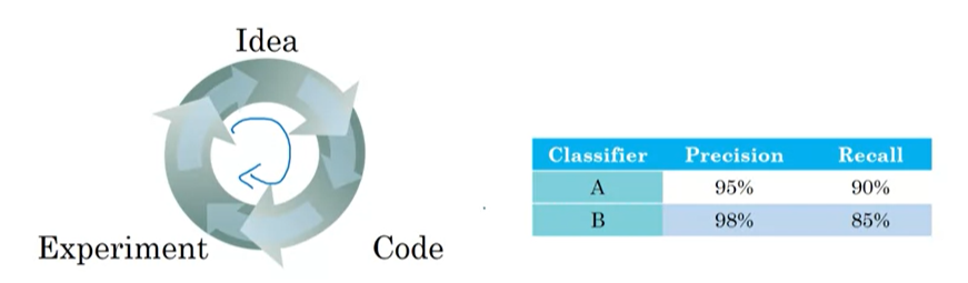 Idea → Code → Experiment์ ๋ฐ๋ณตํ์ฌ ์๊ณ ๋ฆฌ์ฆ์ ๊ณ์ ๊ฐ์ ํ๋ค. ๊ทธ ๊ณผ์ ์์ ์๊ณ ๋ฆฌ์ฆ์ ๊ฐ์ ์ ๋๋ฅผ ํ๊ฐํ๋ ๋ฐฉ๋ฒ์ด single number evalutation metric์ด๋ค.