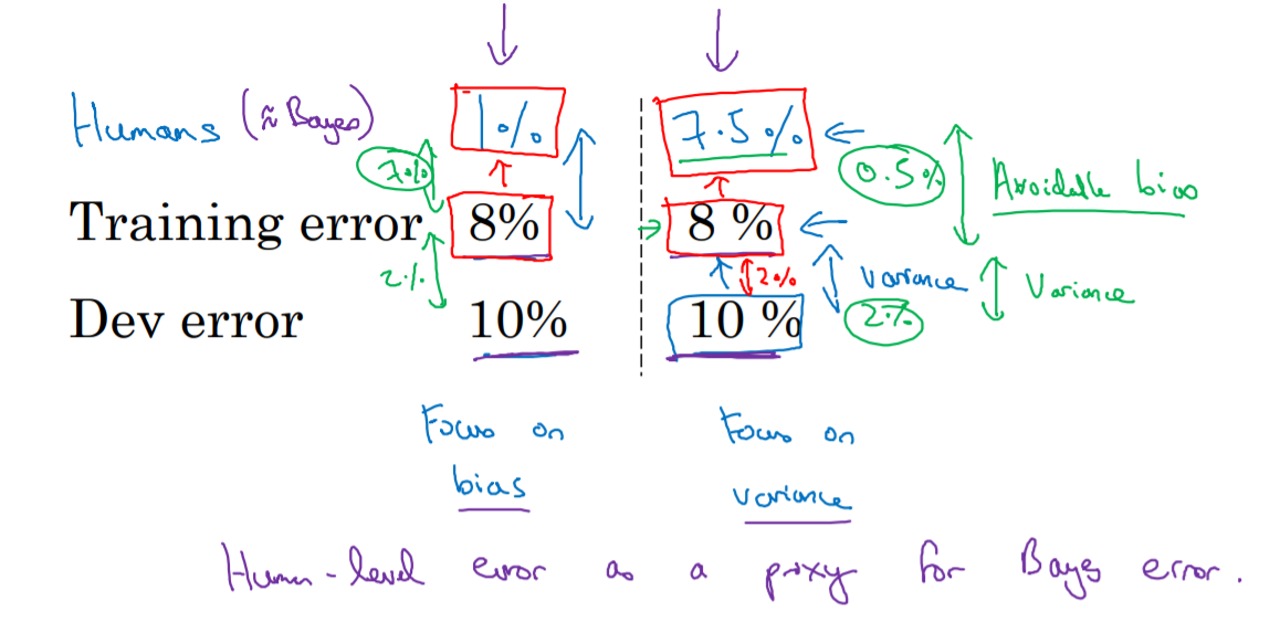 ์์ ์๋ฅผ ๋ณด๋ฉด ๋ค๋ฅธ ์กฐ๊ฑด(training error, dev error)์ ๋ชจ๋ ๊ฐ๊ณ human error (โฉณBayes Error)๊ฐ๋ง ๋ค๋ฅด๋ค. ๊ทธ๋ ์ง๋ง human error๊ฐ 1%์ธ ๊ฒฝ์ฐ classifier๊ฐ bias์ ์ง์คํ๊ฒ ๋๊ณ , human error๊ฐ 7.5%์ธ ๊ฒฝ์ฐ์๋ variance์ ์ง์คํ๊ฒ ๋๋ค๋ ์ฐจ์ด๊ฐ ์๊ธด๋ค.