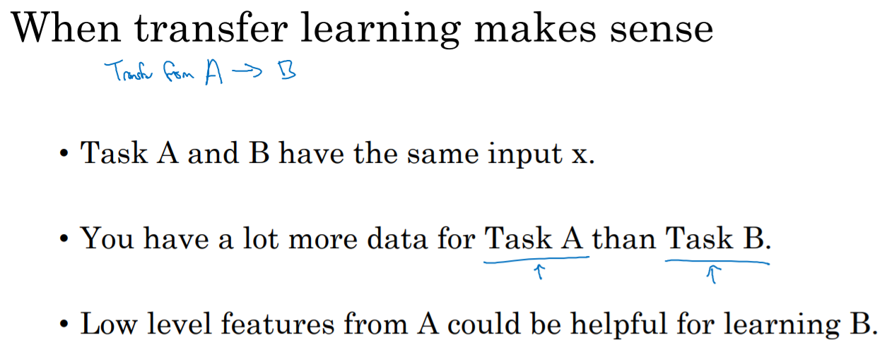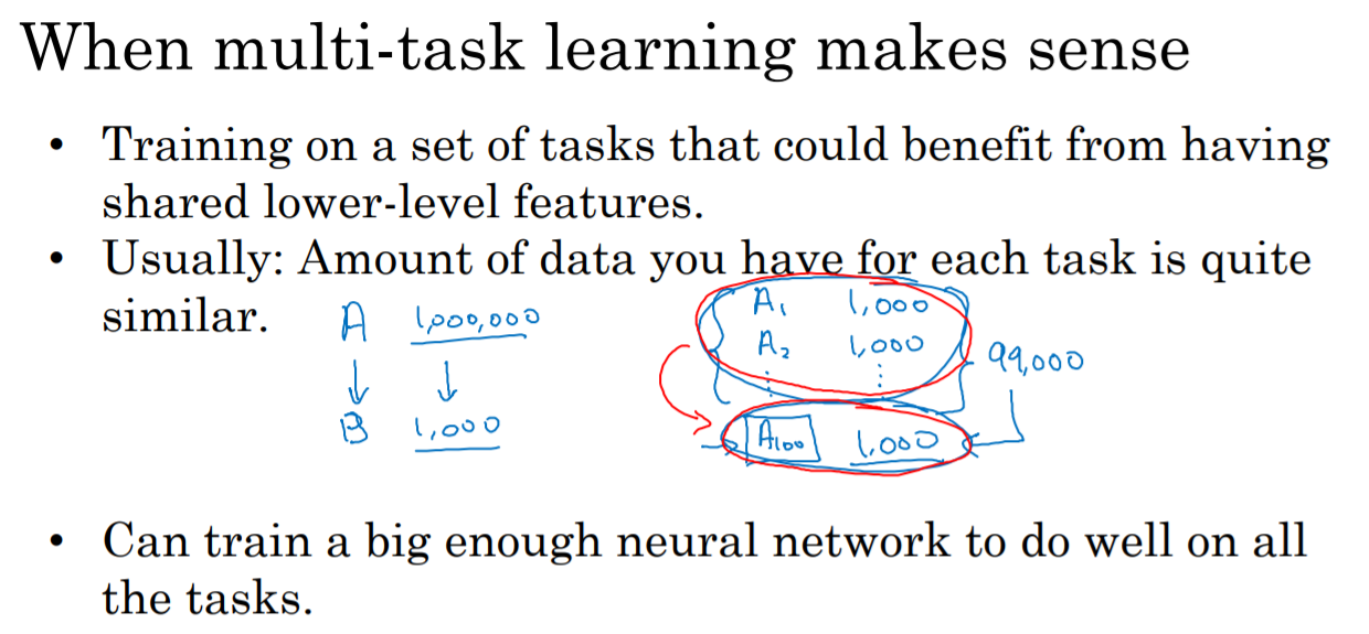 Computer vision object detection์ ์ ์ธํ๊ณ ๋ transfer learning์ด multi-task learning๋ณด๋ค ํจ์ฌ ๋ง์ด ์ฌ์ฉ๋๋ค.