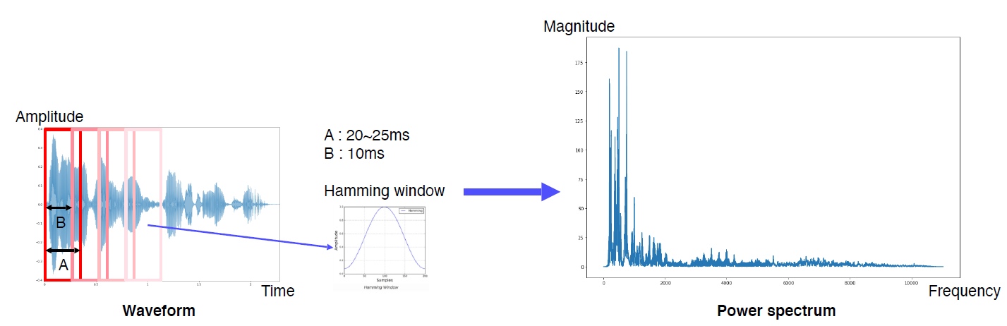 푸리에 변환을 하게 되면 정규분포 모양의 결과물이 나오는데, 그걸 윈도우 단위별로 적용하여 시간에 따른 푸리에 변환을 확인할 수 있게 된다. 또한 Hamming window를 window와 element wise 곱을 해서 가운데 영역의 feature를 더 두드러지게 표현하도록 한다.