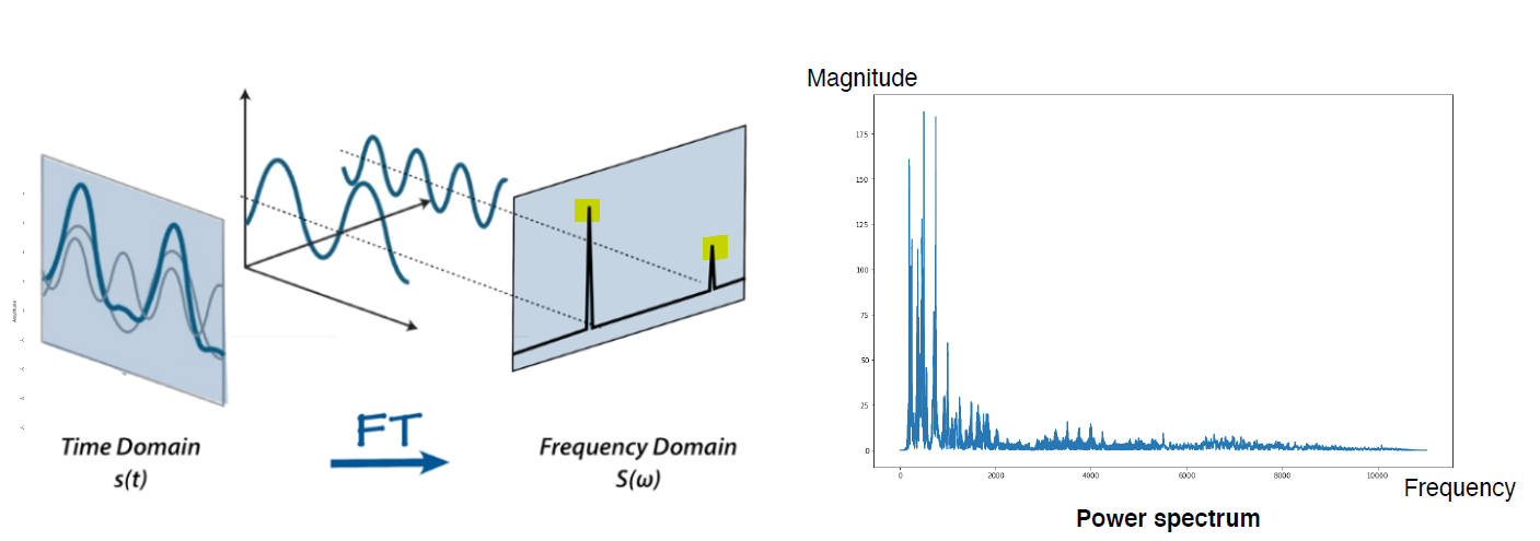 Fourier transform을 하는 이유는 주파수 특징을 파악할 수 있도록 하기 위해서이다. 아래 사진을 보면 Frequency Domain의 특징이 다른 것을 확인할 수 있다.