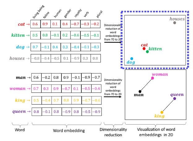Text embedding vector간의 관계특성이 들어가고 일반화가 가능하다. 위의 이미지를 보면 cat과 kitten이 가깝고 cat에는 dog가 house보다 가깝게 위치한다. 남자와 여자의 관계가 king과 queen의 관계와 같은 걸로 볼 수 있다.