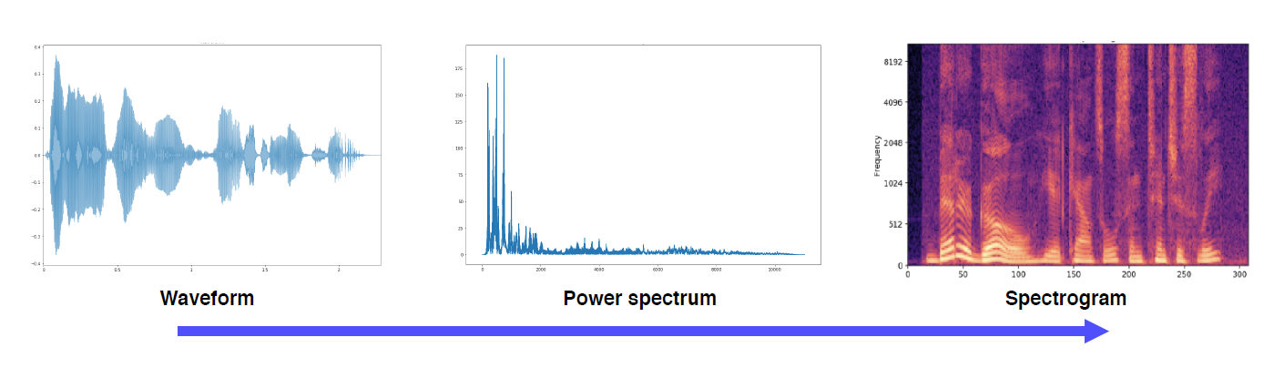 결과적으로 타임축에 따른 spectrum의 stacking을 통해 아래와 같은 spectogram이 만들어져서 nueral network의 인풋이미지로 사용된다. MFCC, melspectogram등의 표현 방식이 있다.