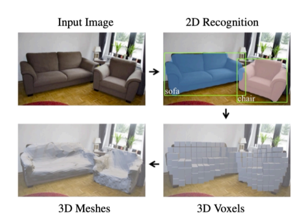 input은 2d image, output은 3d meshs of detected objects