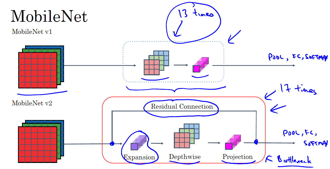 - v1์ depthwise separable convolution์ด 13๋ฒ ๋ฐ๋ณต, v2๋ 17๋ฒ ๋ฐ๋ณต