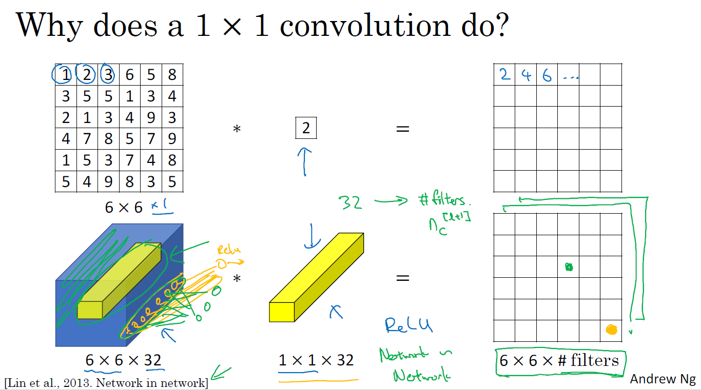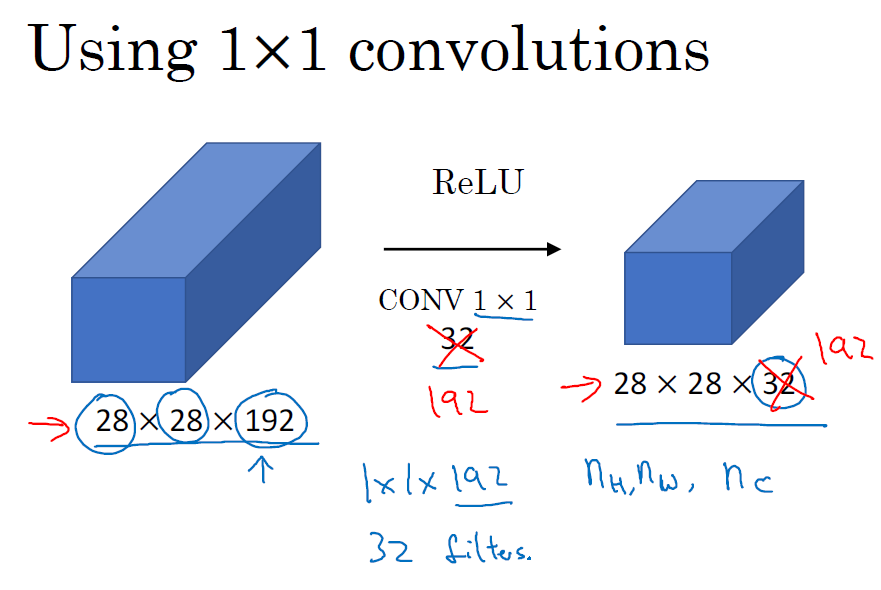 ์์๋ฅผ ๋ณด๋ฉด ๋ค์๊ณผ ๊ฐ๋ค. 28×28×192์ input ํฌ๊ธฐ๋ฅผ 32๊ฐ์ 1×1 CONV ์ ์ฉํ์ฌ 28×28×32๋ก ์์ถํ์๋ค.