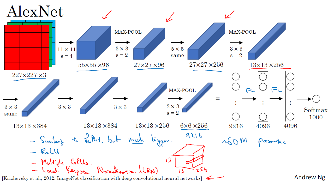 - LeNet๊ณผ ์ ์ฌํ์ง๋ง much bigger. LeNet์ ์ฝ 6๋ง๊ฐ(60k)์ ํ๋ผ๋ฏธํฐ, AlexNet์ 6์ฒ๋ง๊ฐ(60m)์ ํ๋ผ๋ฏธํฐ๋ฅผ ๊ฐ์ง๋ค.