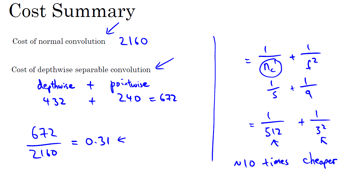 ์์ ๋ดค๋ ์ผ๋ฐ์ ์ธ ๊ณ์ฐ ๋ฐฉ์์์๋ 2160๊ฐ์ ์ฐ์ฐ์ด ํ์ํ๋๋ฐ, depthwise separable ๋ฐฉ์์ ์ฌ์ฉํ๋ฉด 432 + 240 = 672์ ์ฐ์ฐ์ด ํ์ํ ๊ฒ์ ์ ์ ์๋ค. ์ด๋ 2160์ 0.3์ ํด๋นํ๋ ์ซ์์ด๋ค.