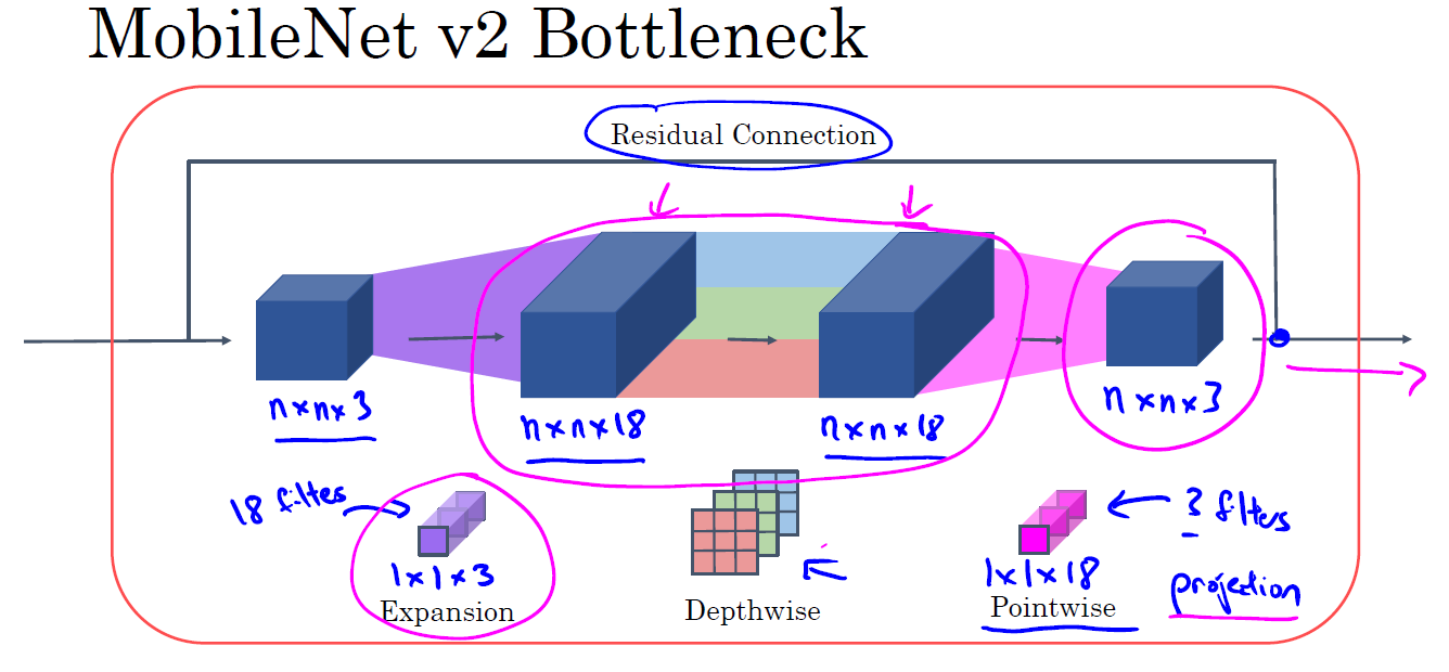 MobileNet v2 ์ bottleneck ๋ถ๋ถ์ ์์ธํ ๋ณด๋ฉด ๋ค์๊ณผ ๊ฐ๋ค.