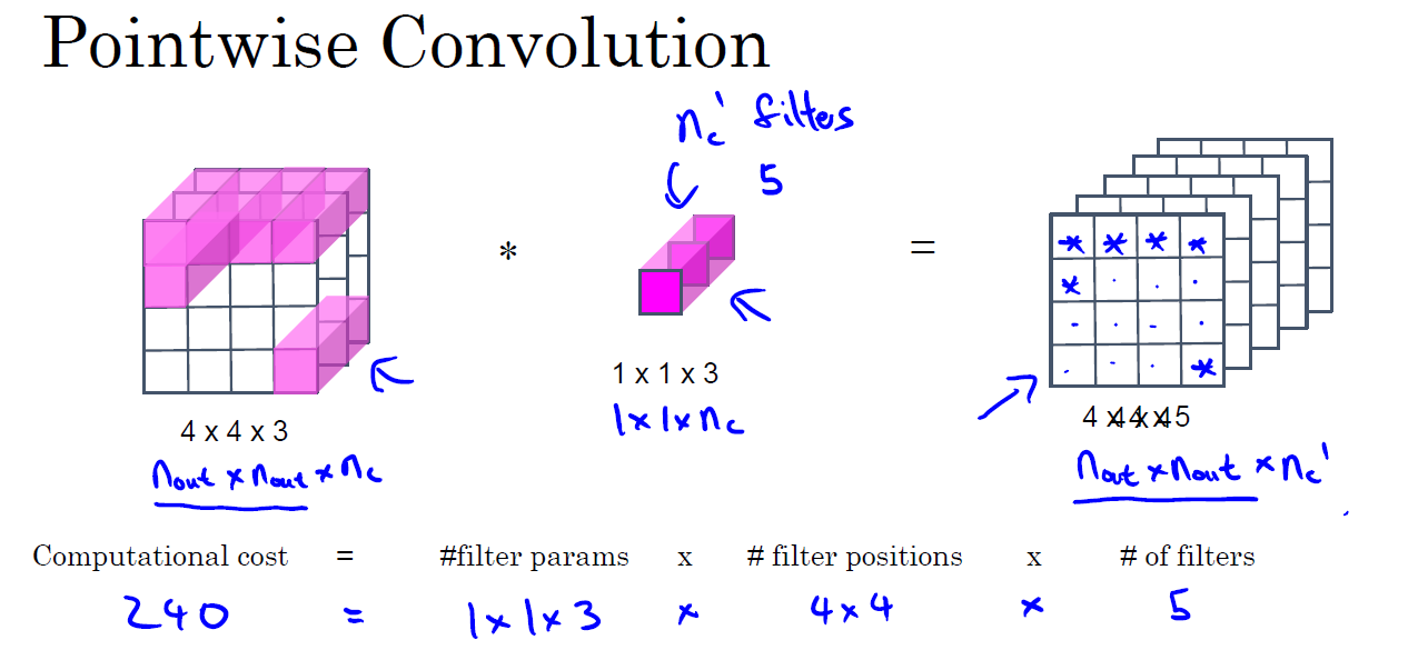 ์ด์ pointwise convolution์ ํตํด nomal ๋ฐฉ์๊ณผ output์ shape์ ๋ง์ถฐ์ค๋ค. Computational cost๋ฅผ ๊ณ์ฐํด๋ณด๋ฉด filter์ ํ๋ผ๋ฏธํฐ * output ํ๋ผ๋ฏธํฐ์ด๋ฏ๋ก, 1×1×3 * 4×4×5 = 240 ์ด๋ค.