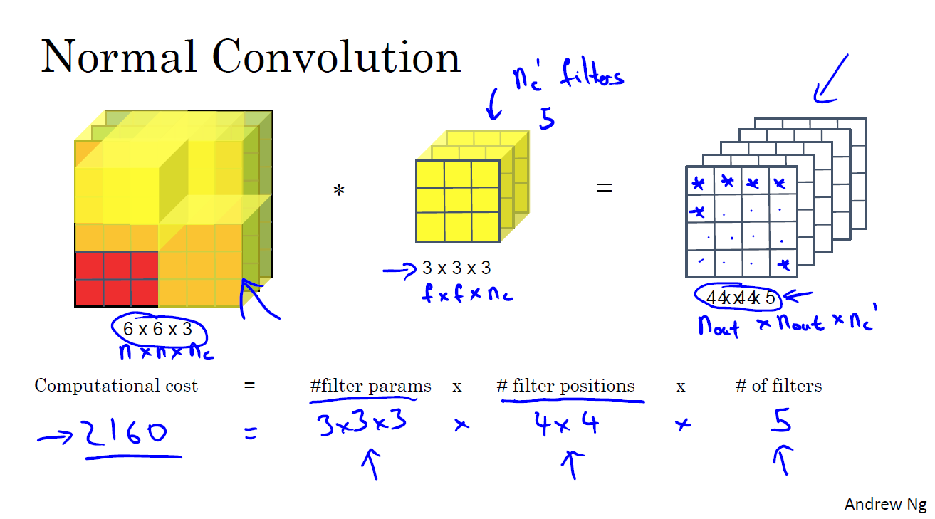 input size๊ฐ 6×6×3 ์ด๊ณ 5๊ฐ์ 3×3×3 filter๋ก conv ์ฐ์ฐ์ ํ๋ค๊ณ ํ๋ฉด, Computational cost๋ filter์ ํ๋ผ๋ฏธํฐ ๊ฐ์์ output์ ํ๋ผ๋ฏธํฐ ๊ฐ์์ ๊ณฑ์ด๋ฏ๋ก 3×3×3 * 4×4×5 = 2160์ด๋ค.