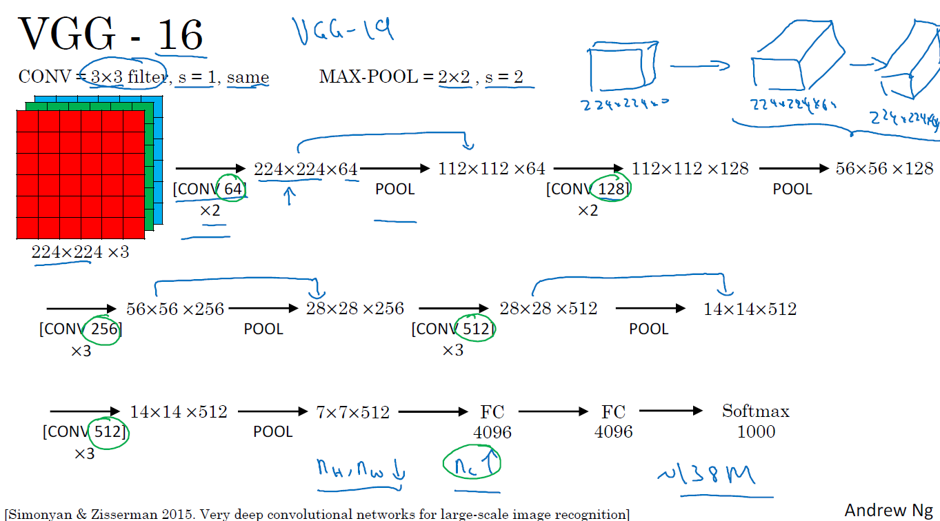 - ๋ง์ ํ๋ผ๋ฏธํฐ ๊ฐ์ง๊ณ ์๋ ๋์ ์ ํจ์ฌ ๋จ์ํ ๊ตฌ์กฐ. ํญ์ ๋์ผํ stride, padding, size์ Conv layer, Pooling layer ์ฌ์ฉ