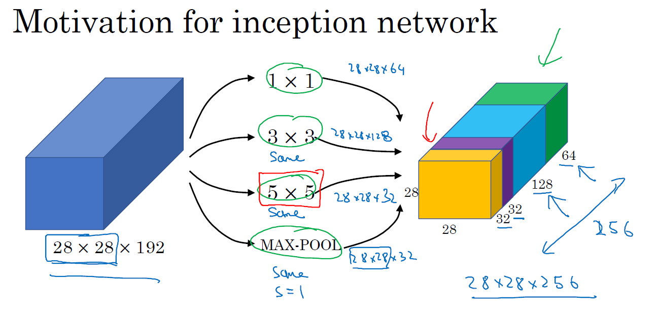 1×1 filter, 3×3 filter, pooling layer, 5×5 filter ๋ฑ ๋ฌด์์ ์ฌ์ฉํ ์ง ๊ณ ๋ฏผํ์ง๋ง๊ณ output size์ ํฌ๊ธฐ๋ง ๊ณ ๋ คํด์ ๋ชจ๋ ํ์ตํ๋ค.
