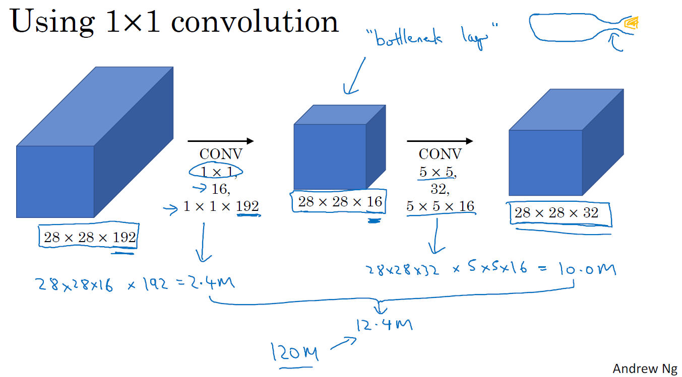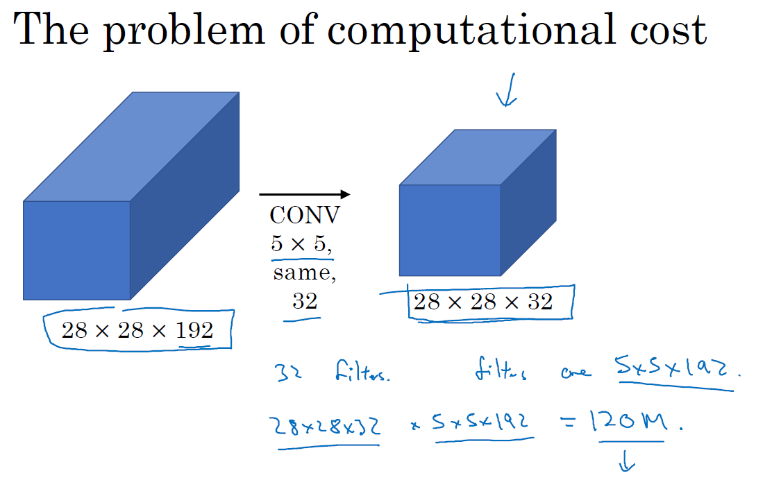 filter size๊ฐ 5×5×192 ์์ ๊ณ์ฐํ ์ ์๊ณ ์ ์ฒด ๊ณ์ฐํด์ผํ๋ ๊ฐ์๋ filter์ ํ๋ผ๋ฏธํฐ์ output ํ๋ผ๋ฏธํฐ์ ๊ฐ์๋ฅผ ๊ณฑํ ๊ฐ์ด๋ค. ๋ฐ๋ผ์ 5×5×192 * 28×28×32 = ์ฝ 1์ต 2์ฒ๋ง ๊ฐ์ ์ฐ์ฐ์ด ํ์ํ๋ค