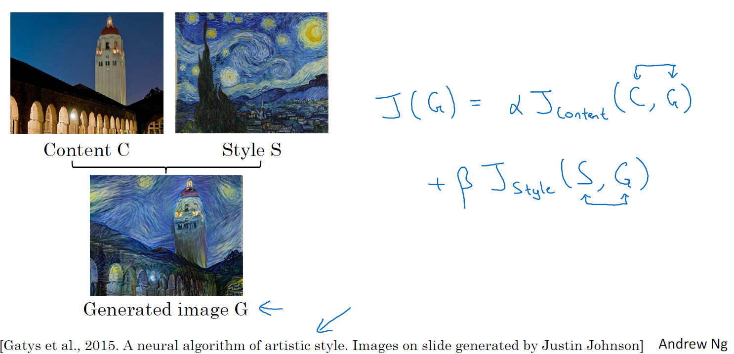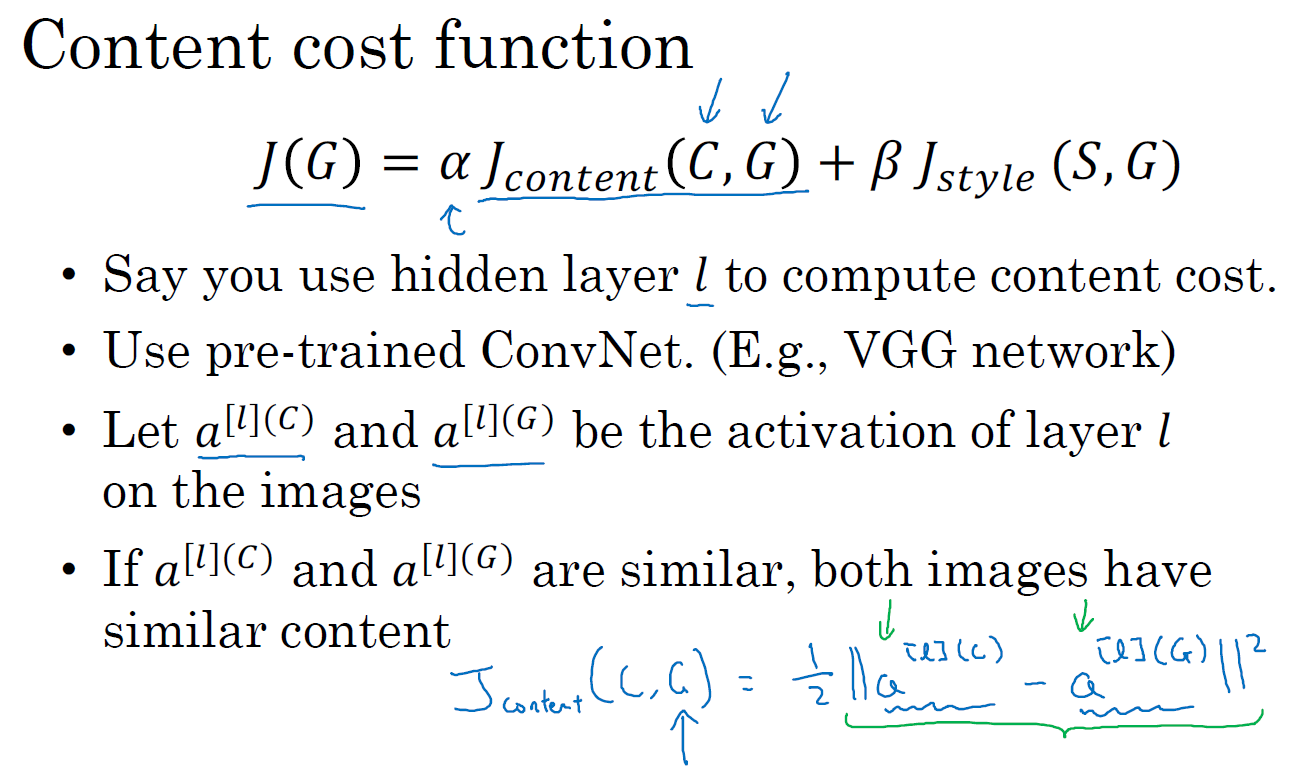 Style Transfer์์๋ content์ style ๋ ๊ฐ์ ๋ํ cost function์ด ํ์ํ๋ค. J_content์ J_style์ ํฉ์ด ์ต์ข cost function์ผ๋ก ์ฌ์ฉ๋๋ค.