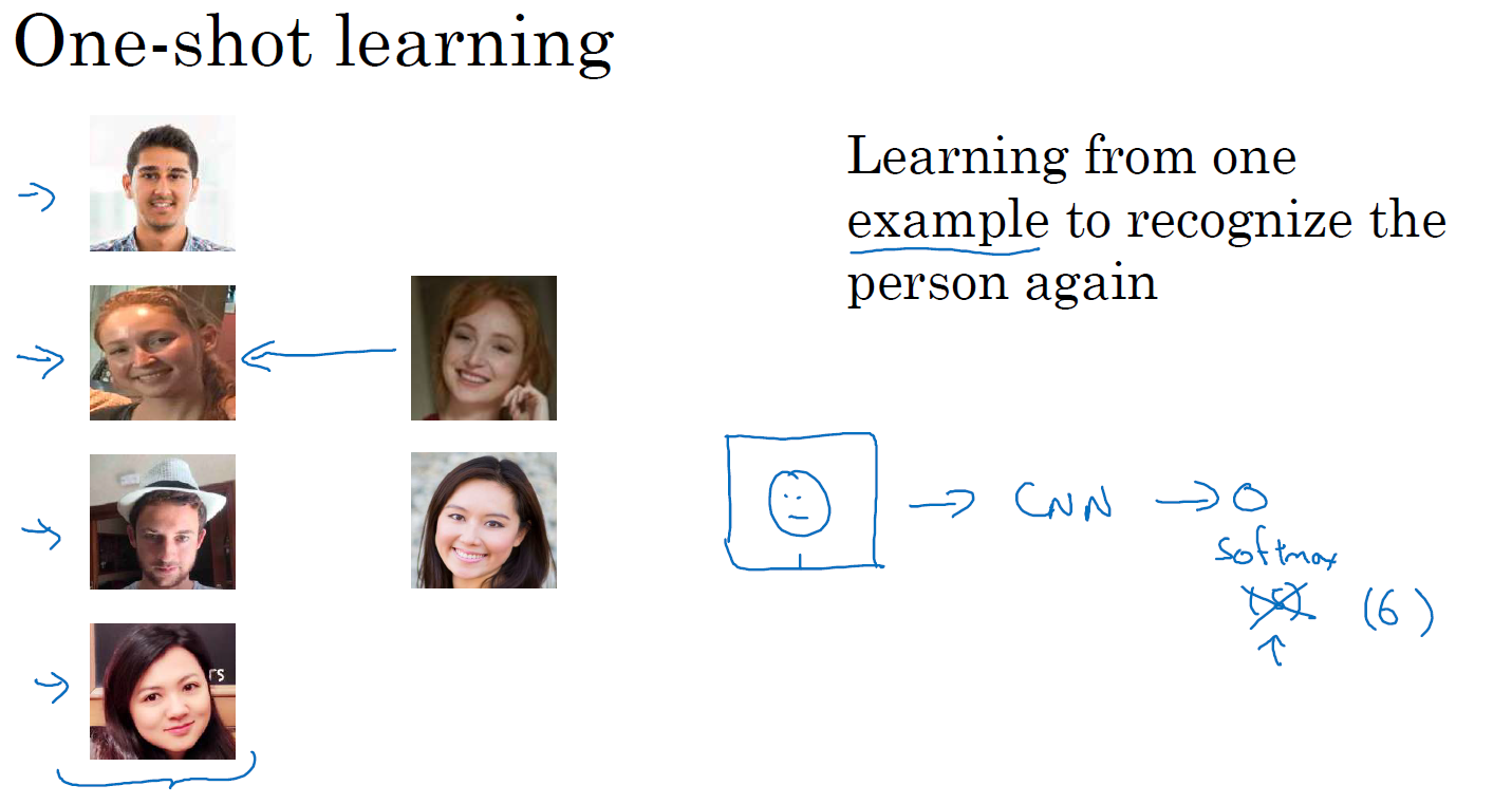 One shot learning์ด๋ ํ ์ฌ์ง(example)๋ง ๋ณด๊ณ ๋ถ๋ฅ๋ฅผ ํ๋ ๊ฒ์ ๋งํ๋ค. Face recognition์์ one-shot learning์ ํด๊ฒฐํด์ผํ ๋ฌธ์ ์ค์ ํ๋์ด๋ค. ์๋์ ์์์์๋ ์ค๋ฅธ์ชฝ์ ์ฌ์ง์ ๋ณด๊ณ ์ผ์ชฝ์ ์ฌ์ง๊ณผ ๊ฐ์ ์ฌ๋์ธ ๊ฒ์ ํ๋ณํด์ผํ๋ค. Similarity function์ ์ฌ์ฉํด์ ๋ ์ด๋ฏธ์ง๊ฐ์ ์ ์ฌ๋๋ฅผ ๊ตฌํ๋ค. d(img1, img2)๋ก ํ์ํ๊ณ ํจ์ d์ ๊ฒฐ๊ณผ๊ฐ threshold ์ดํ์ด๋ฉด ๊ฐ์ ์ฌ๋, ์ด๊ณผ๋ฉด ๋ค๋ฅธ ์ฌ๋์ผ๋ก ํ๋ณํ๋ค