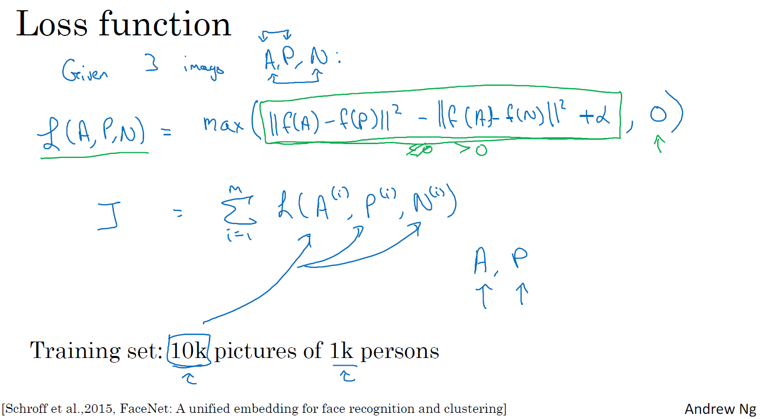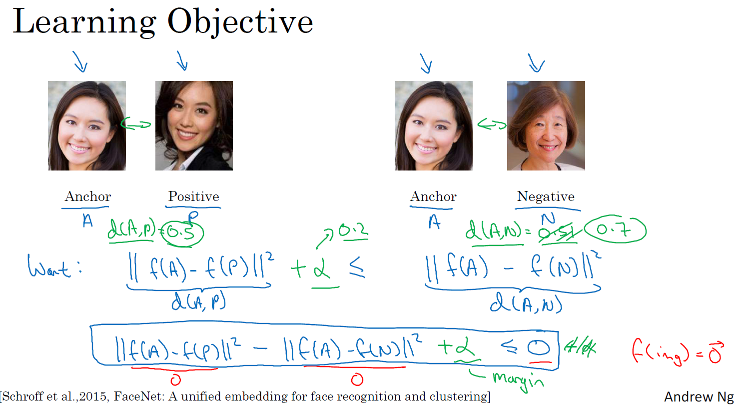 ์ผ๊ตด ์ด๋ฏธ์ง์ ์ธ์ฝ๋ฉ์ ๋ํด์ ์ ๊ฒฝ๋ง์ ํ๋ผ๋ฏธํฐ๋ฅผ ์ ํ์ต์ํค๊ธฐ ์ํด์ Triplet Loss Function์ ์ฌ์ฉํ๋ค. ๋ ์ผ๊ตด์ ๋น๊ตํ๊ธฐ ์ํด์๋ Anchor image์ Positive image, Negative image 3๊ฐ๊ฐ ํ์ํ๋ค. Anchor image๋ ๊ธฐ์ค ์ด๋ฏธ์ง์ด๊ณ , Positive image๋ ๋์ผํ ์ธ๋ฌผ์ ์ด๋ฏธ์ง์ด๊ณ Negative image๋ ๋ค๋ฅธ ์ธ๋ฌผ์ ์ด๋ฏธ์ง์ด๋ค. Anchor์ Positive๊ฐ์ distance function์ ๊ฒฐ๊ณผ์ Anchor์ Negative ๊ฐ์ distance function์ ๊ฒฐ๊ณผ๋ฅผ ๋ด์ผํ๋๋ฐ, ์ด ๋ margin parameter์ธ α๊ฐ ์ฌ์ฉ๋๋ค. α๋ฅผ ์ฌ์ฉํ๋ ์ด์ ๋ d(A, P)์ d(A, N)์ ๊ฐ์ด ๊ฐ์ผ๋ฉด ์๋์ ๋ค๋ฅด์ง๋ง ๋ ๊ฐ์ ์ฐจ๊ฐ 0 ์ดํ๋ผ๋ ๊ธฐ์ค์ ๋ง์กฑ์ํค๊ธฐ ๋๋ฌธ์ ์๋์ ๋ค๋ฅด๊ฒ ํ์ต๋ ์ ์๊ธฐ ๋๋ฌธ์ด๋ค. ๋ฐ๋ผ์ 0.2์ margin parameter๋ฅผ ์ฌ์ฉํด์ผํ๋ค.
