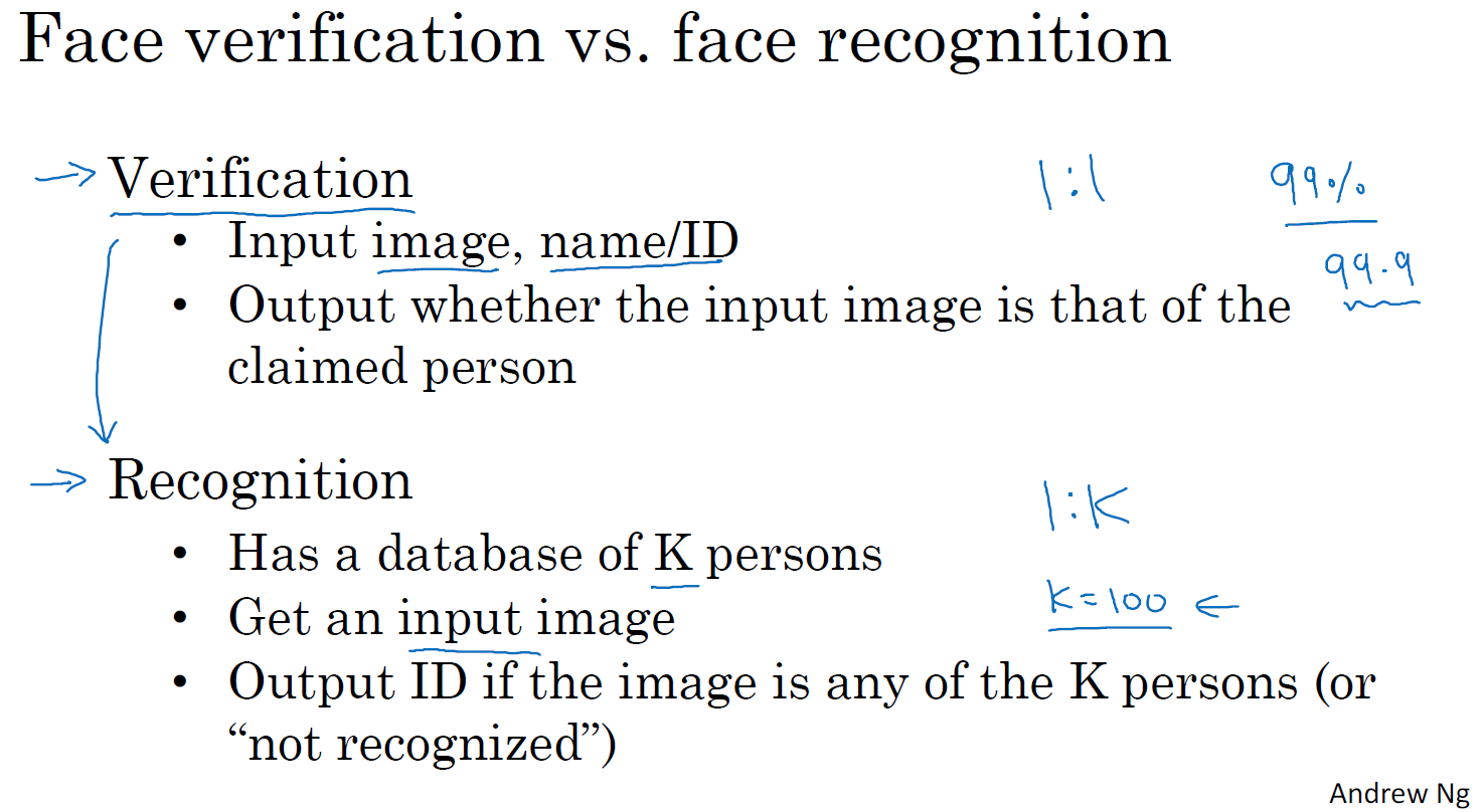 Face recognition ๋ฌธ์ ๋ verification๊ณผ ๊ตฌ๋ณ๋๋ค. Face verification์ 1:1 ๋น๊ต๋ผ๋ฉด Face Recognition์ 1:N ๋น๊ต๋ผ๋ ์ ์ด ๊ฐ์ฅ ํฐ ์ฐจ์ด์ ์ด๋ค.