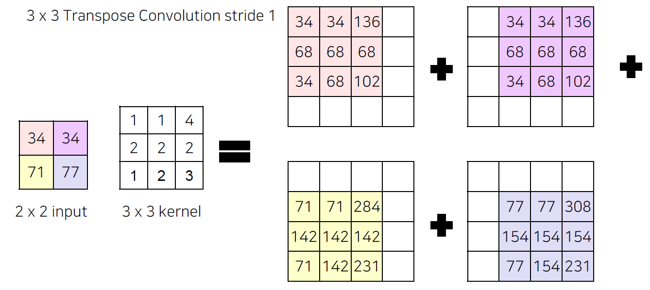 💥 Transposed Convolution에 사용되는 Convolution 과정에서 사용되는 같은 값의 kernel이 아니고 Backpropagation에서 Update되는 학습 가능한 파라미터 입니다!