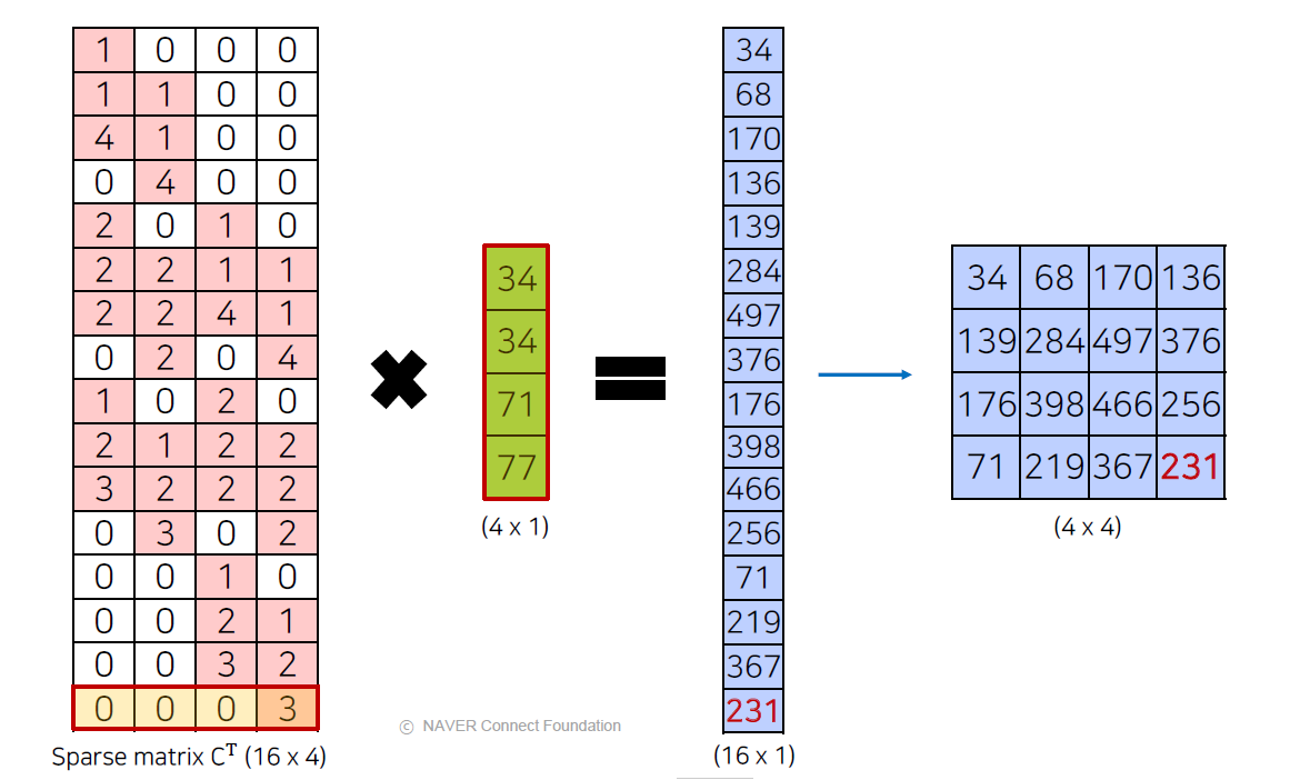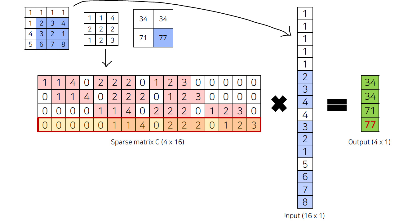 각각의 input 픽셀과 kernel 픽셀을 stride만큼 이동하여 elementwise product를 수행한 후 같은 위치의 값은 모두 summation