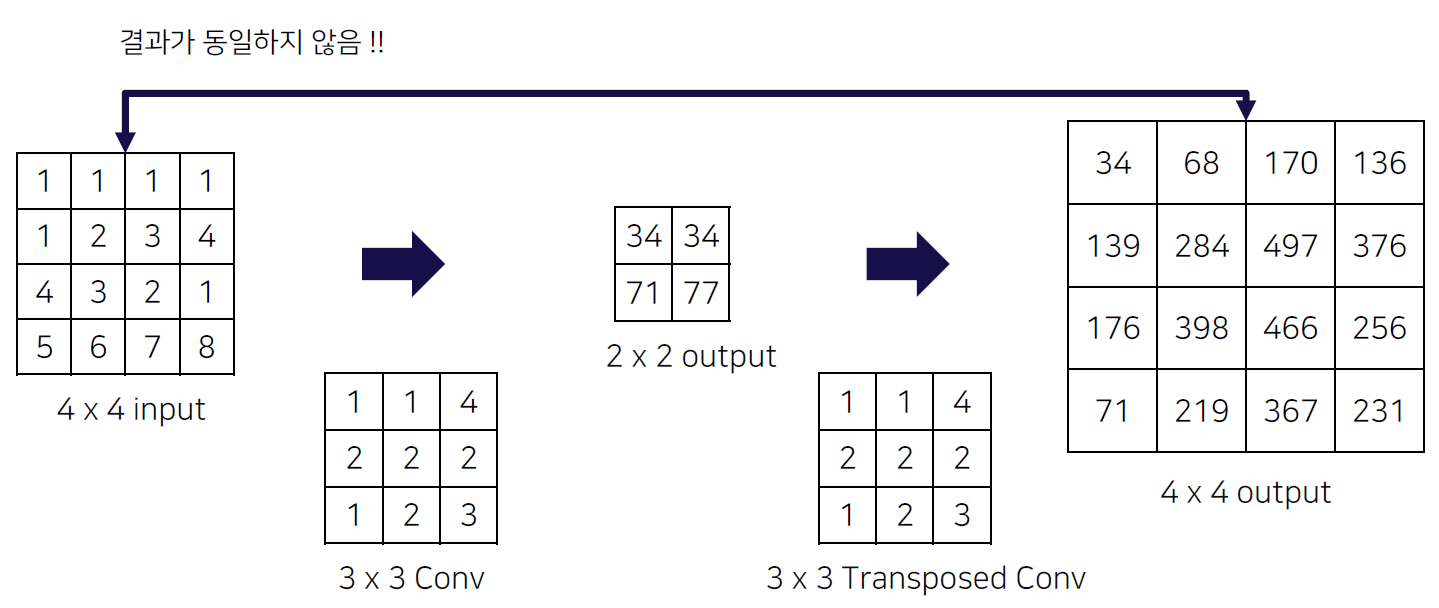 Transposed Convolution 으로 표현하는 이유는 Convolution을 한 결과를 Transpose 하여 Convolution을 진행했을 때, 앞서 계산했던 Transposed Convolution의 결과가 나오기 때문