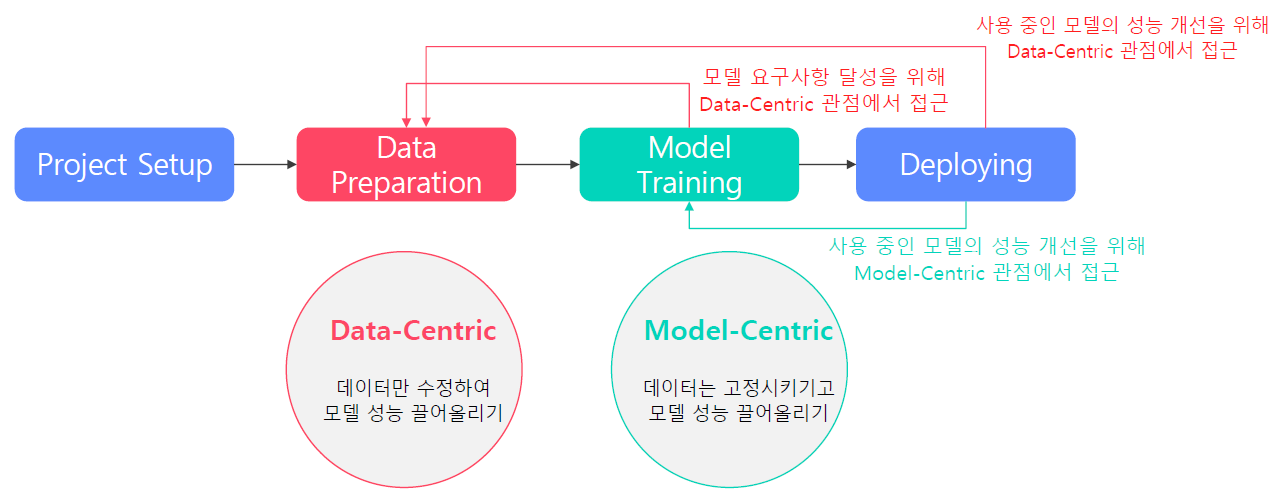 Project Setup 단계에서 모델 요구사항(처리 시간, 목표 정확도, 목표 qps, Serving 방식, 장비 사양 등)을 정한다. 이 요구사항을 충족시키기 위해 방법에는 Data-Centric 과 Model-Centric 두 가지가 있다.