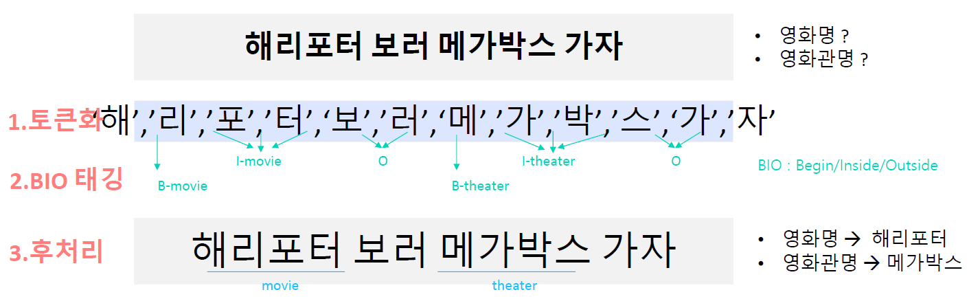BIO 태깅 사용 : 문장에서 기 정의된 개체에 대한 값 추출