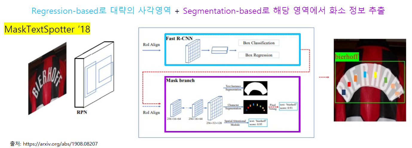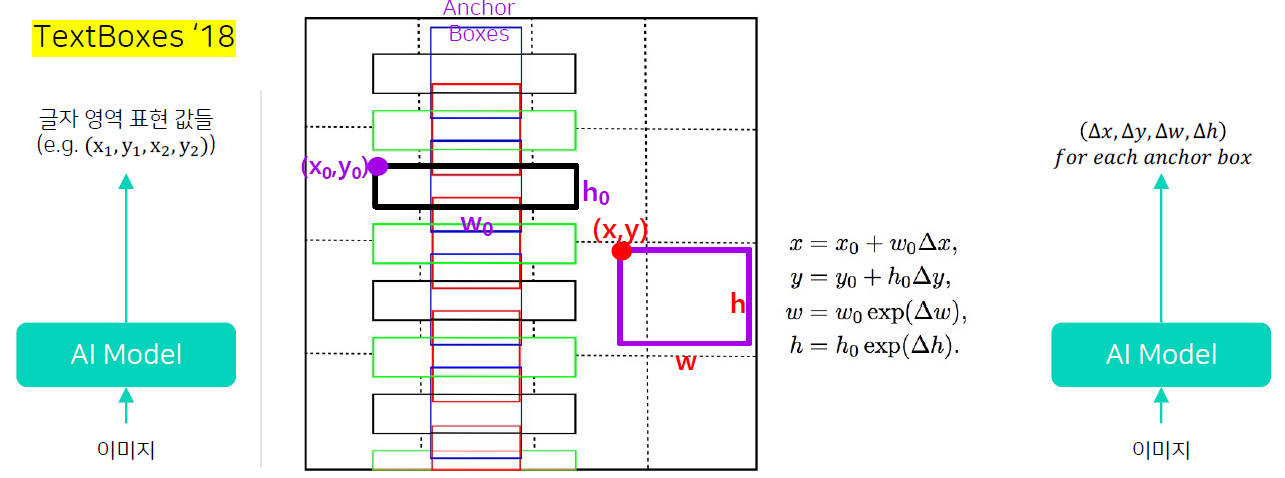 ✔ Regression-based의 경우 이미지를 입력으로 받아서 anchor box를 이용하여 글자의 위치 영역을 바로 출력한다.