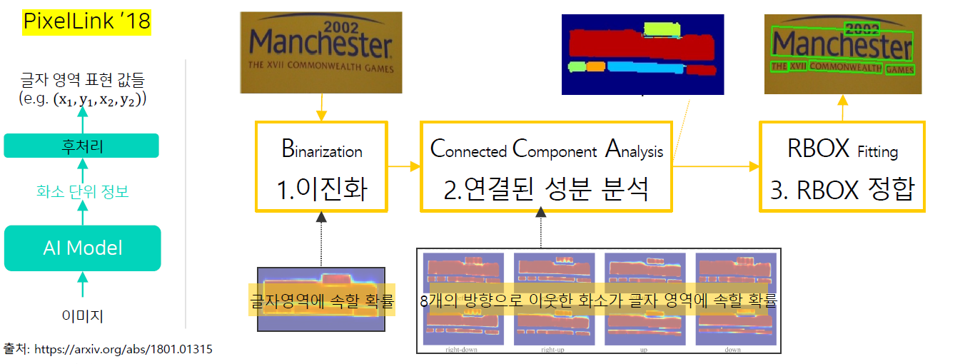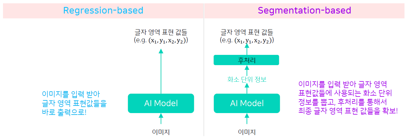 ✔ Segmentation-based의 경우 이미지에서 바로 출력을 하는 것이 아니라 중간에 후처리 과정이 포함된다. 이미지를 입력 받아 글자 영역 표현값들에 사용되는 화소 단위 정보를 뽑고, 후처리를 통해서 최종 글자 영역 표현 값들을 확보한다.
