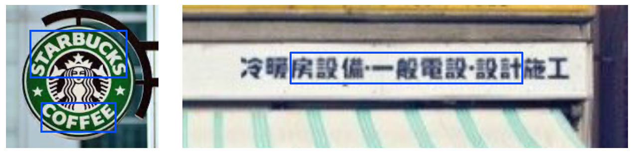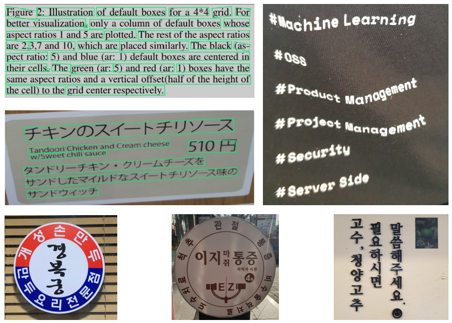 위의 예시와 같이 글자 객체는 일반 객체와 다른 특징을 갖는다. 매우 높은 밀도, 극단적 종횡비, 특이 모양(구겨진 영역, 휘어진 영역, 세로 쓰기 영역), 모호한 객체 영역, 크기 편차 등의 특징을 볼 수 있다.