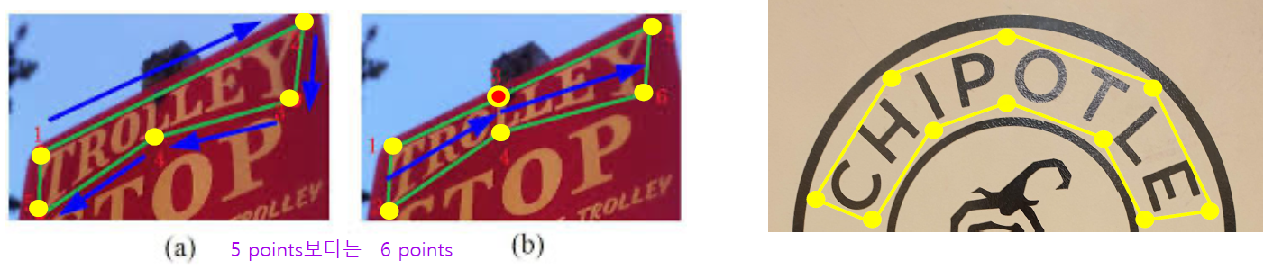 휘어진 글자의 경우에는 Polygon 형태로 어노테이션을 진행한다. 주의할 점은 2n개의 points를 찍는 것이다. 위의 두 점과 쌍이 되는 아래의 두 점을 잡았을 때 특정 글자 영역이 되도록 Polygon을 그린다.