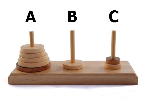 하노이의 탑 설명 : 위의 그림과 같은 세 개의 막대에 크기가 모두 다른 원판이 꽂혀 있다. A에서 C까지 모든 원판을 옮기는 것이 목표이고, 옮기는 과정에서 큰 원반이 작은 원반 위에 올려져서는 안된다.